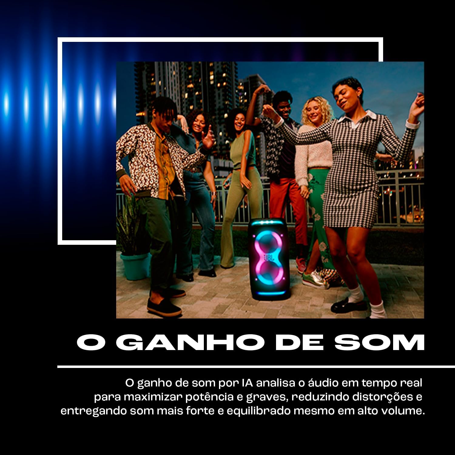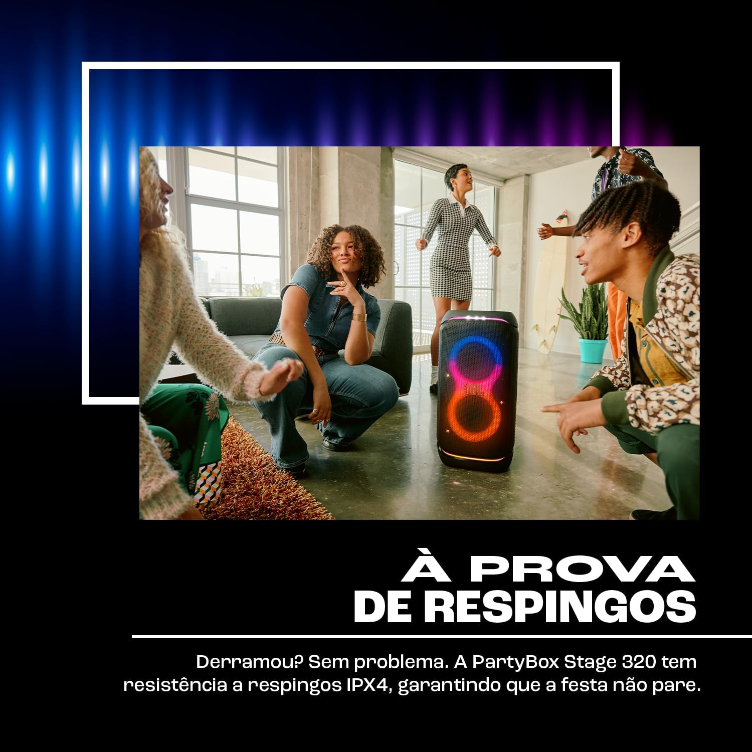 A JBL PartyBox Stage 320 entrega 240W RMS com show de luzes integrado e até 18 horas de autonomia — tudo em um sistema portátil com rodas e alça telescópica. Disponível na Amazon com frete grátis.