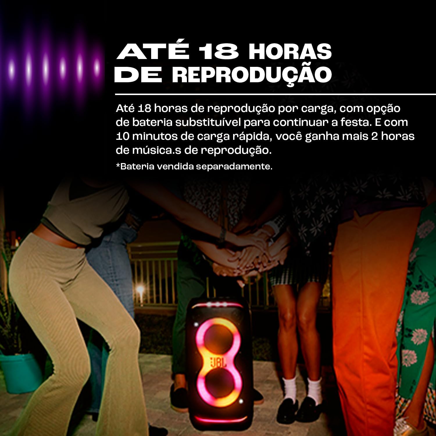 A autonomia de 18 horas é um ponto forte consistente para eventos de longa duração. Além disso, a JBL adotou um sistema de bateria substituível — o que significa que, com uma unidade reserva (vendida separadamente), o tempo de uso pode ser estendido sem interrupção.