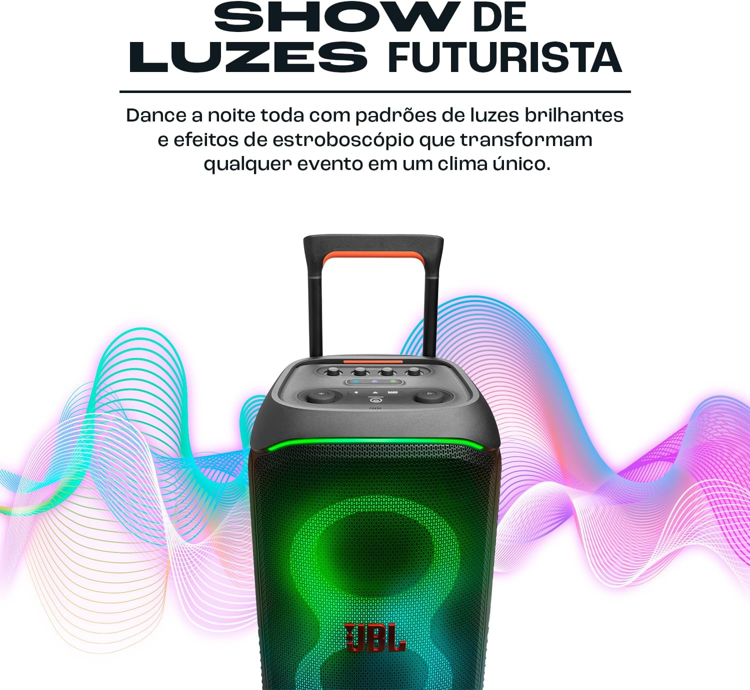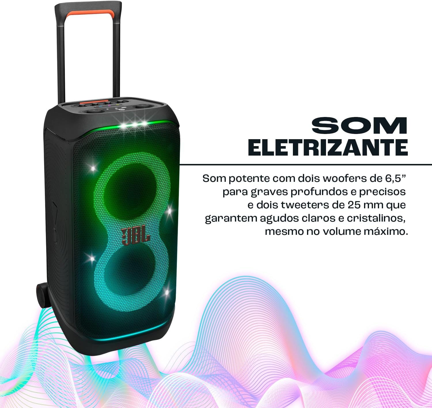 Caixa de som portátil com potência de 240W RMS, dois woofers de 6,5 polegadas e tweeters de domo de 25mm. Possui show de luzes sincronizado com a música, bateria de 18 horas e certificação IPX4 à prova de respingos. Inclui alça telescópica e rodas para fácil transporte.